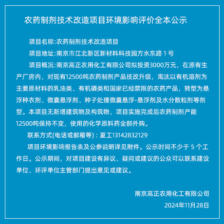 定將現(xiàn)有項目整體搬遷至江蘇省如東沿海經濟開發(fā)區(qū)。搬遷完成后,將形成年產1000噸戊唑醇、200噸吡丙醚、500噸噻蟲啉、200噸環(huán)丙唑醇原藥的生產規(guī)模... |